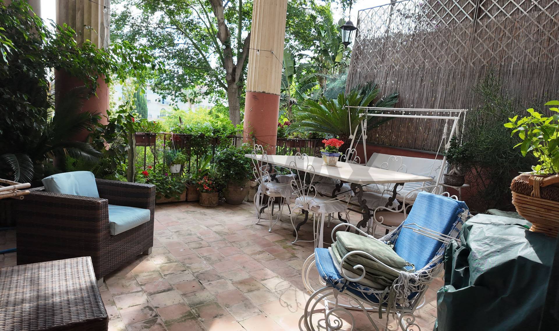 Varcando il maestoso portone d'ingresso, si viene accolti da un atrio luminoso che offre uno scorcio sul magnifico giardino esotico. Le palme washingtoniane e da cocco, insieme a piante di arance, avocado, kiwi, limoni giganti e corisie speciose, creano un'atmosfera incantevole, perfetta per chi ama la natura e la tranquillità.